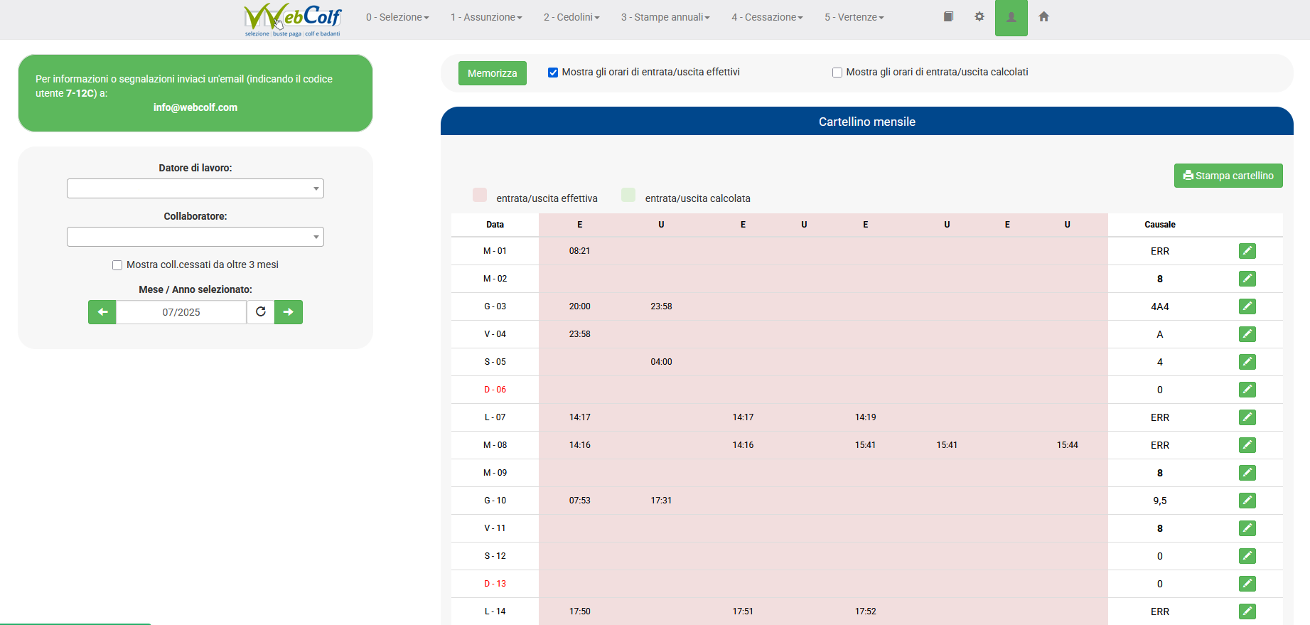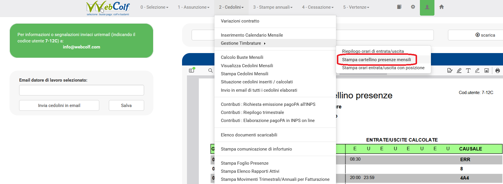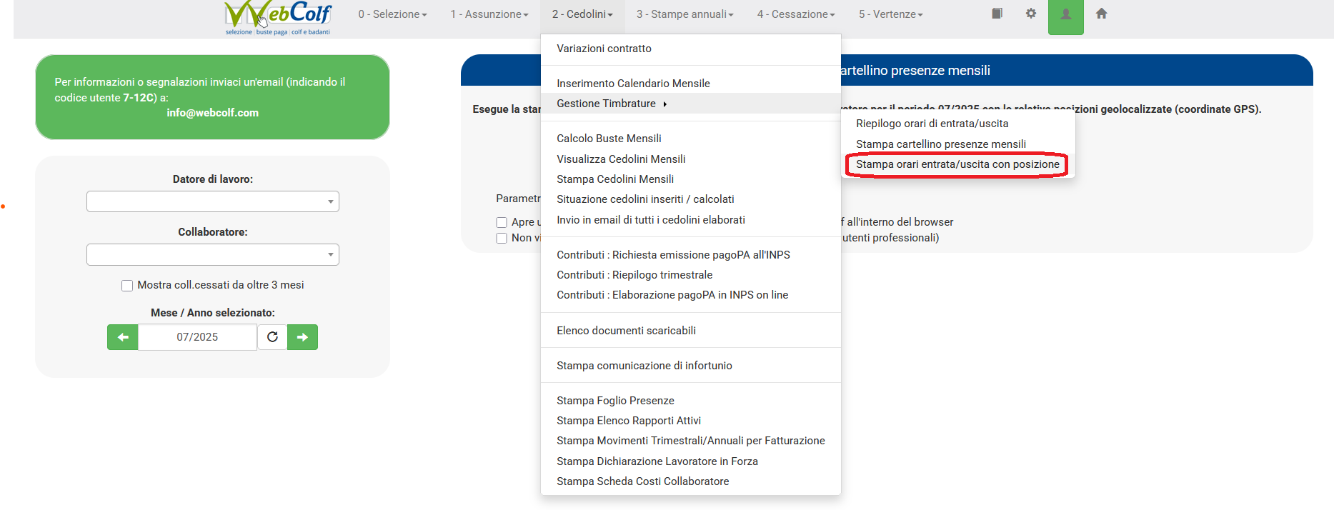 6. Il datore di lavoro, collegandosi in Webcolf, è già in grado di verificare e constatare le timbrature effettuate posizionandosi in Cedolini | Gestione Timbrature | Riepilogo orari di entrata o uscita".