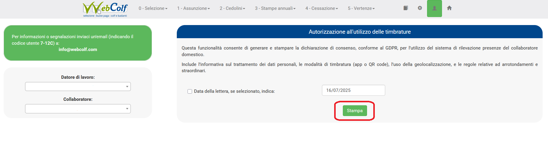 3. Il datore dovrebbe quindi posizionarsi nel menu Assunzione | Timbrature e stampare la lettera informativa relativa le timbrature al fine di informare il collaboratore della raccolta dei dati. Si precisa che si tratta di un'informativa e non di una lettera autorizzativa in quanto il sistema di rilevazione delle presenze in generale non necessita di autorizzazione ( fig. 4 ).