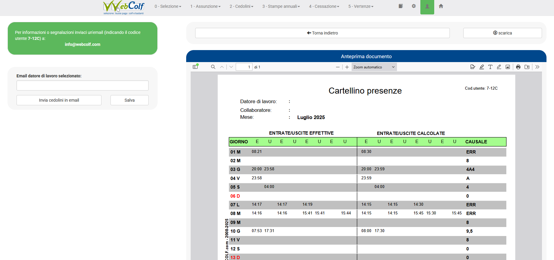 Nel caso in cui da calendario per qualche giornata compaia la voce 'error' significa che è presente un'unica timbratura ( di sola entrata o uscita ).