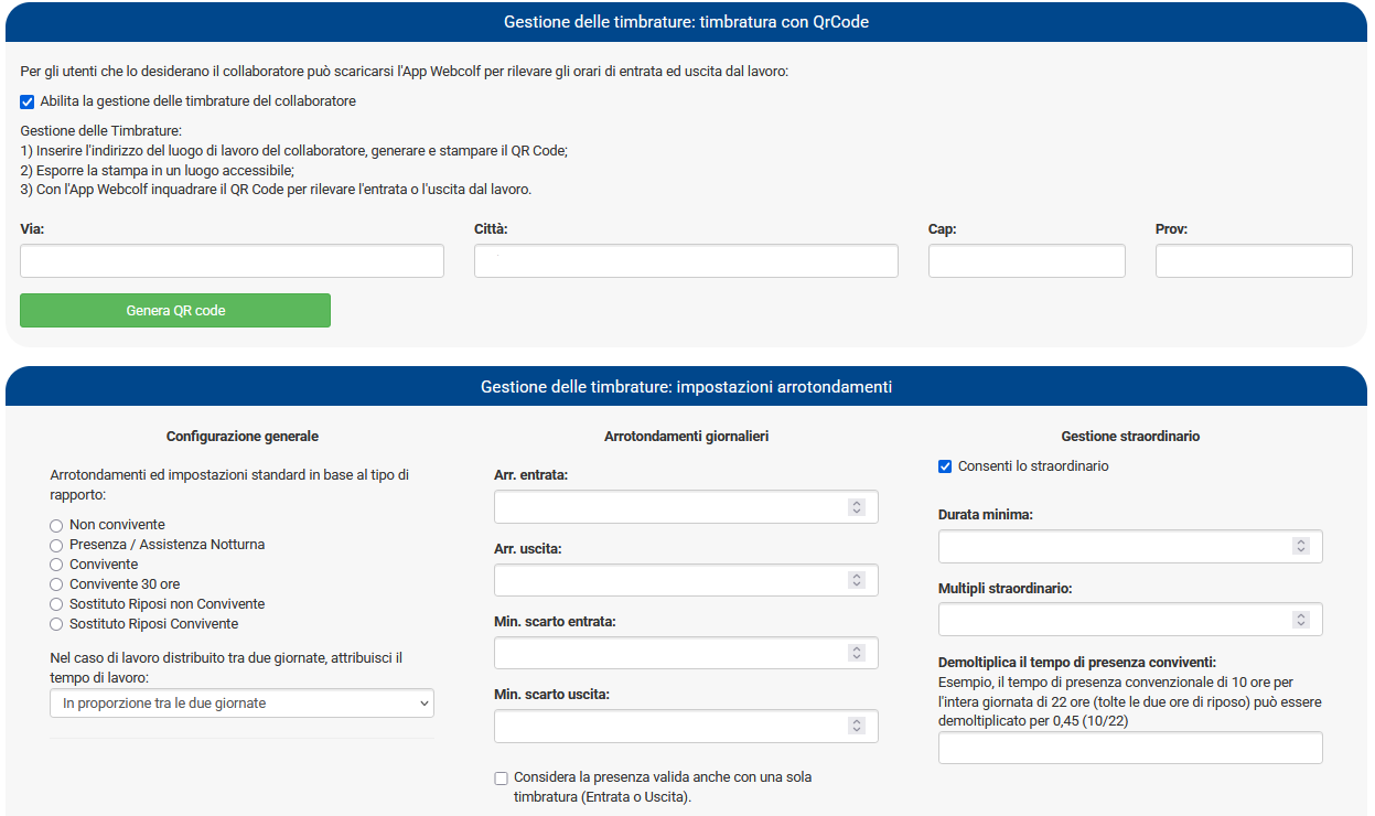 Viene indicato l'indirizzo del luogo di lavoro che, se già inserito all'interno del programma in Assunzione | Inserimento collaboratore | dati anagrafici, apparirà in modo automatico. Alternativamente il datore può indicarlo e poi stampare il QrCode che verrà generato, che dovrà esere esposto sul luogo di lavoro ( magari affisso all'ingresso dell'abitazione ). In alternativa al QrCode il collaboratore potrà timbrare utilizzando il posizionamento GPS, si tratta di una doppia modalità che le parti possono liberamente decidere di adottare alternativamente.
